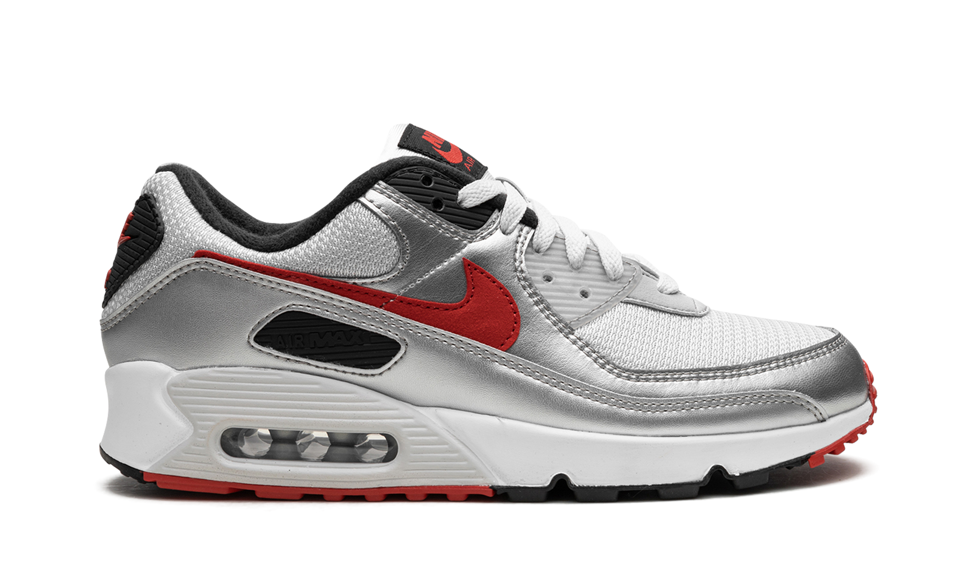The Nike Air Max 90 “Icons - Silver Bullet” is a colorway of the retro running shoe inspired by the equally iconic Nike Air Max 97 of the same nickname. Celebrating its Air Max legacy, Nike dresses the Air Max 90 in a colorway reminiscent of the Air Max 97’s “Silver Bullet” release from 1997. The sneaker has a white mesh base contrasted with Silver Metallic leather overlays. A fiery red Swoosh appears on the sides. Black “Air Max” branding is found within a branding window on the lateral side of the heel. Classic “Nike Air” detailing appears on the heel and on the tongue tag. A clear Air bubble in the heel of the white foam midsole completes the look. Release date: April 13, 2023 Icons - Silver Bullet